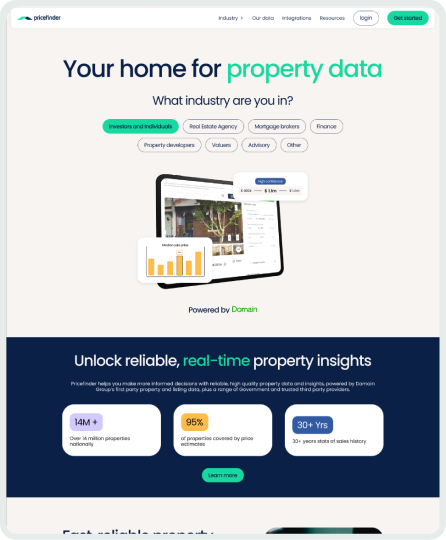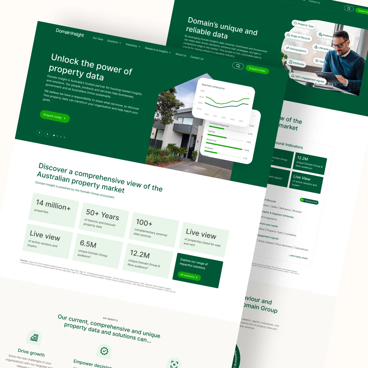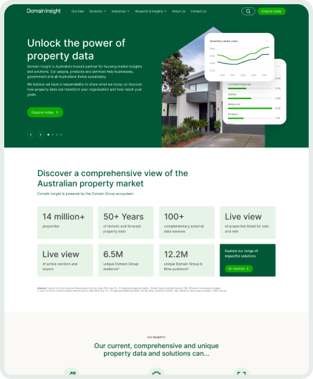 Domain Insight delivers property data and analytics for enterprise clients across Australia. Checkpoint Creative was engaged to refresh the website and create a clearer, more dynamic platform that showcases Domain Insight’s expertise, aligns with updated messaging, and strengthens engagement with enterprise users.