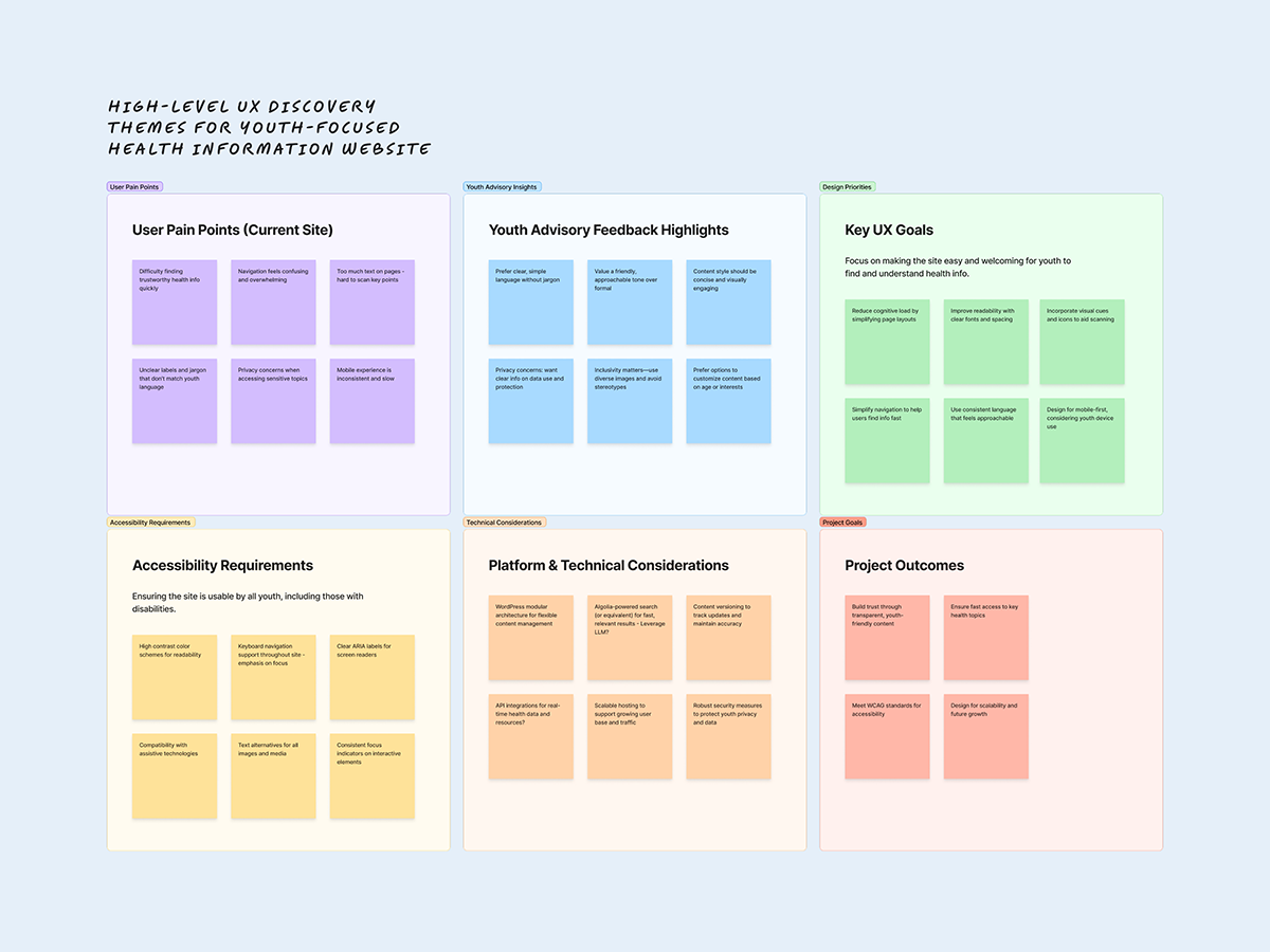 Drawing on insights from youth advisory sessions, we built a UX framework that supports varied reading levels, simplifies information discovery, and reduces cognitive load. The design focuses on clarity, warmth, and trust, while aligning fully with accessibility best practice.