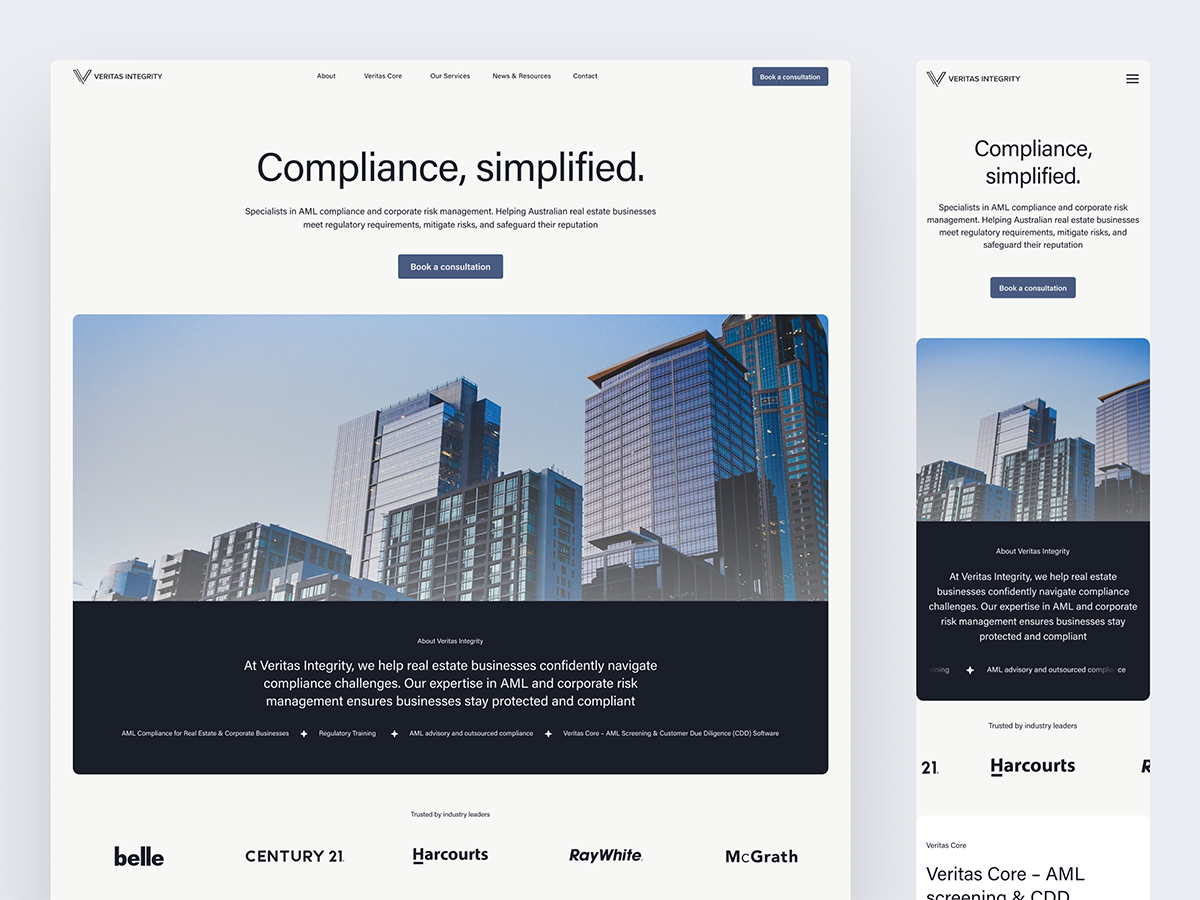 We designed the full UI for the public facing marketing site, creating a clear and credible digital presence for Veritas Integrity. The website focused on explaining their AML and KYC services, presenting their methodology with clarity, and establishing trust with regulated businesses. The design language is clean, professional and built to support future growth as the product ecosystem expanded.