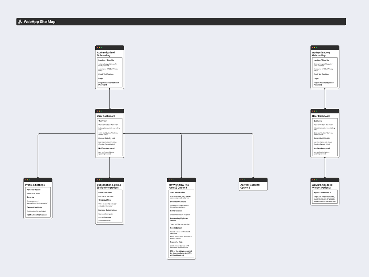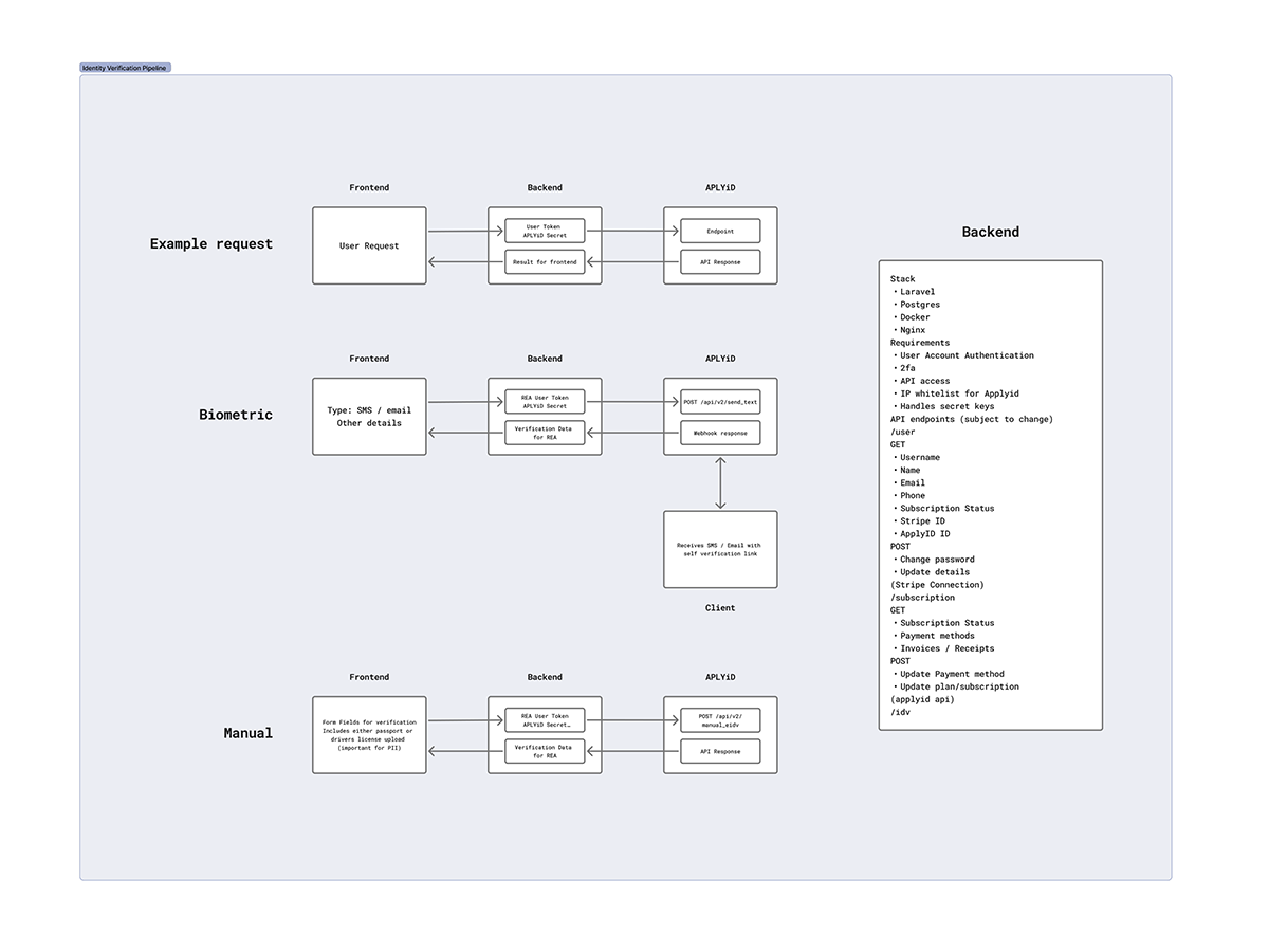 We produced a detailed technical outline for the IDV process that Veritas planned to deliver through Veritas Core. The architecture mapped how the system would interact with AplyID for biometric and manual verifications, how authentication and two factor verification should be handled, and how information would move between services. The design separated PII held by AplyID from metadata held by Veritas to support compliance and reduce risk. We also documented the responsibilities of each backend service including verification routing, subscription management through Stripe, API integration, and user role logic. This early stage architecture gave Veritas clarity on how the platform would function and scale.